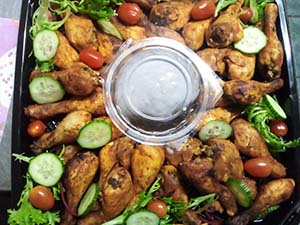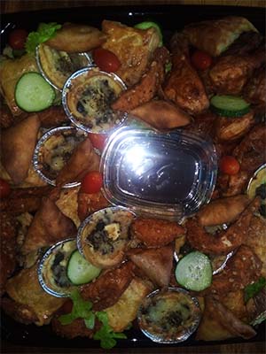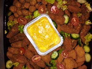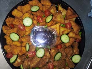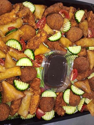 10 pc of Chicken + 10 chicken strips, pies, samoosas, quiche with dip + salad